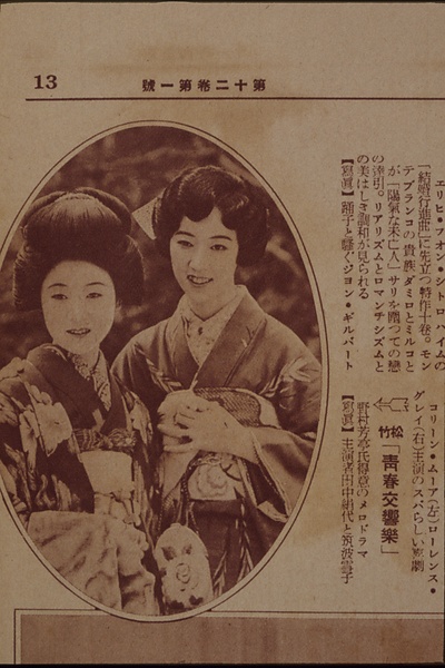 | 身装画像コード | D7joy:[女優モデル(この年の人気女優,封切り映画の出演女優)] D2ma:[丸髷] D2yo:[洋髪;ウエーブ] D3ut:[打合せ;襟あき;ぬき襟] D3ob:[帯の締め方;帯の位置] D5ei:[映画・舞台のための衣裳] |