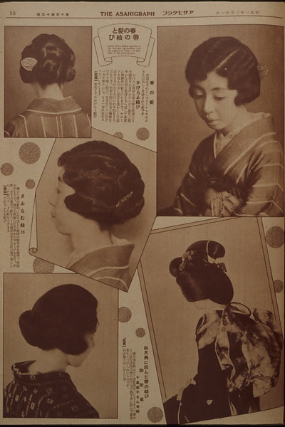 | 説明 | 流行の髪型と帯結び。かげろう結び/さふらん結び/御大典に結んだ帯の結び――御所車(千葉益子さん着附)。 |