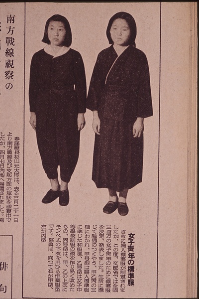 説明 「さきに婦人標準服が制定されましたが、この度、文部省では全国三百万の女子青年のために標準服を決定、発表しました。生活に応じて融通のつくやう、甲乙丙の三種にわかれ、甲号型は婦人標準服に準じた和服風、乙号型は女子中等学校制服の襟を作り易く改めたもの、丙号型は、甲、乙の上衣にモンペ式の下衣を用ひる作業服型です。写真は向つて右が甲型、左が丙型」。