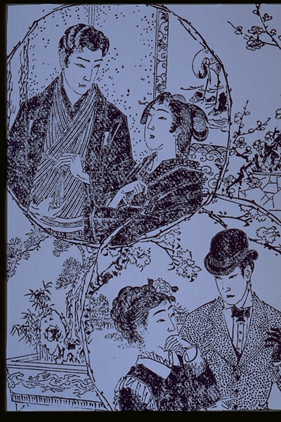 | 身装画像コード | Jkp:[カップル(親子・夫婦・恋人・友人など)] D014:[若い男(20歳前後~30歳前後)] Vhao:[羽織] D005:[20~30歳代の女性;年増] D2so:[束髪(前期縦型の)] D3ut:[打合せ;襟あき;ぬき襟] Wbo:[かぶり物一般;帽子] Wne:[ネクタイ;ネックバンド] D1ka:[髪飾り(櫛,簪,リボン)] D80:[姿勢;ポーズ(特異な姿勢・ポーズ・格好一般)] |
