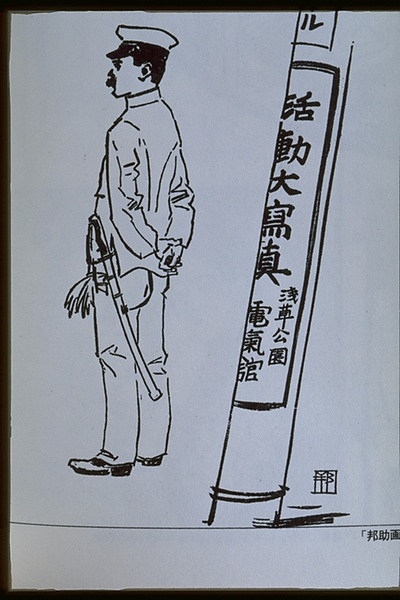 | キーワード | 巡査;後ろで手を組む;サーベル;電信柱;浅草公園電気館活動大写真の貼り紙 |