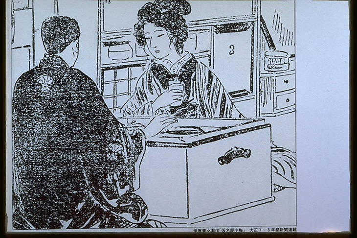 | キーワード | 長火鉢の差し向かい;女芸人;黒紋付き羽織;後ろ姿;背面 |
