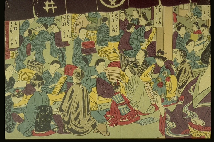 G010:[呉服店] G01:[店舗 ex.店構え全景,出入りする客,従業員] H84:[店舗内(売場)のスペース] D5te:[展示・陳列・収納など] D4ban:[商人;番頭] K90:[新聞雑誌の紙面・広告] |