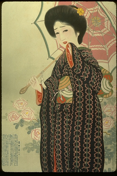 | 説明 | 画家による口絵の説明――「なす紺に角入菱つなぎの縞御召の袷に、波に源氏香を取合せた唐織の帯、七宝つなぎの半襟は何れも最近全盛の色と柄です。すきだと思つたものも流行がすたると、すぐ厭になるものであるから、私はどんな色柄が好ましいと云ふことは申されません。髪形はつい此間歌舞伎座で観せました新橋東会の演芸の折に、見物席の美しい人達をスケッチブックに取入れて参りましたものによりて画きました。予ねてから私は東京の粋は、人形町辺にあると思つて居りますから、時々人形町辺の呉服屋へ這入つて居る事があります。こゝに画きましたものも人形町の呉服屋で見せて貰つたのです。尤も傘は京橋あたりで得ました思ひ付きの色合です。ばら咲く頃の色合としては先づふさはしい色かもしれません。遂ひ呉服屋の提灯持の様になつて、をかしう御座います…………」。 |