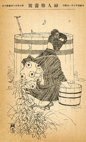 | キーワード | 井戸端;しゃがむ;米とぎ;米を洗う;竪縞のきもの;襷掛け |