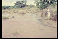 基地の前を流れる流水を見守る梅棹忠夫と富田浩造(N.H.)